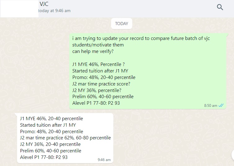 Over the years, I have tutored many VJC and TJC students. If they start tuition shortly after J1 MY or promo and their results are at least 20-40 percentile before tuition, it is highly possible they can get A in alevel.