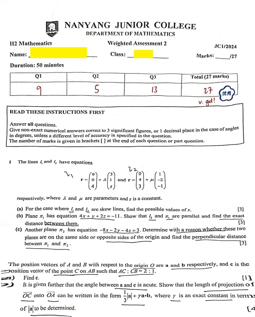 So I covered all the common J1 topics and also integration techniques, complex numbers and vectors in the same group tuition. The VJC student learnt vectors (VJC J2 topic), and the NYJC student learnt integration techniques (post promo J1 topic) and complex numbers (J2 topic). In order to cover more topics than their school promo, I have to teach at a faster pace than their school, with only two hours tuition weekly.