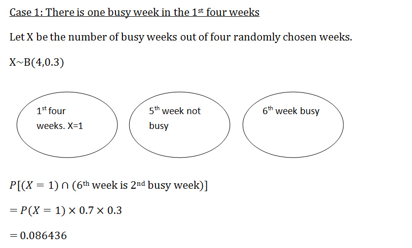 Calculate the probability that in a period of 6 consecutive weeks, the 6th week is the second busy week, given that there is at most one busy week in the first four weeks.