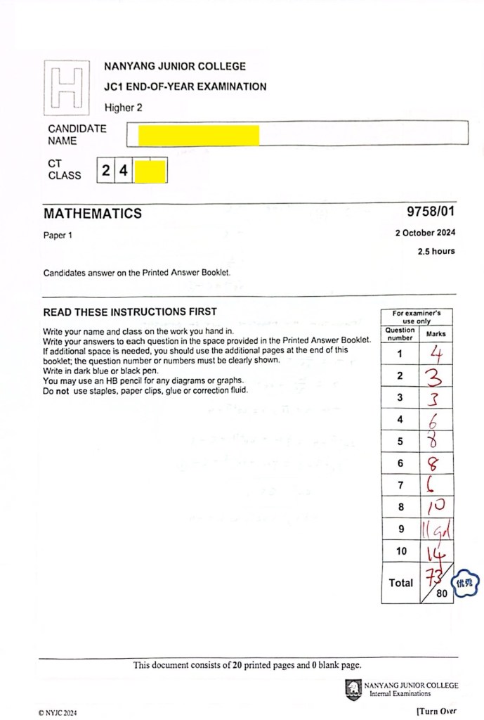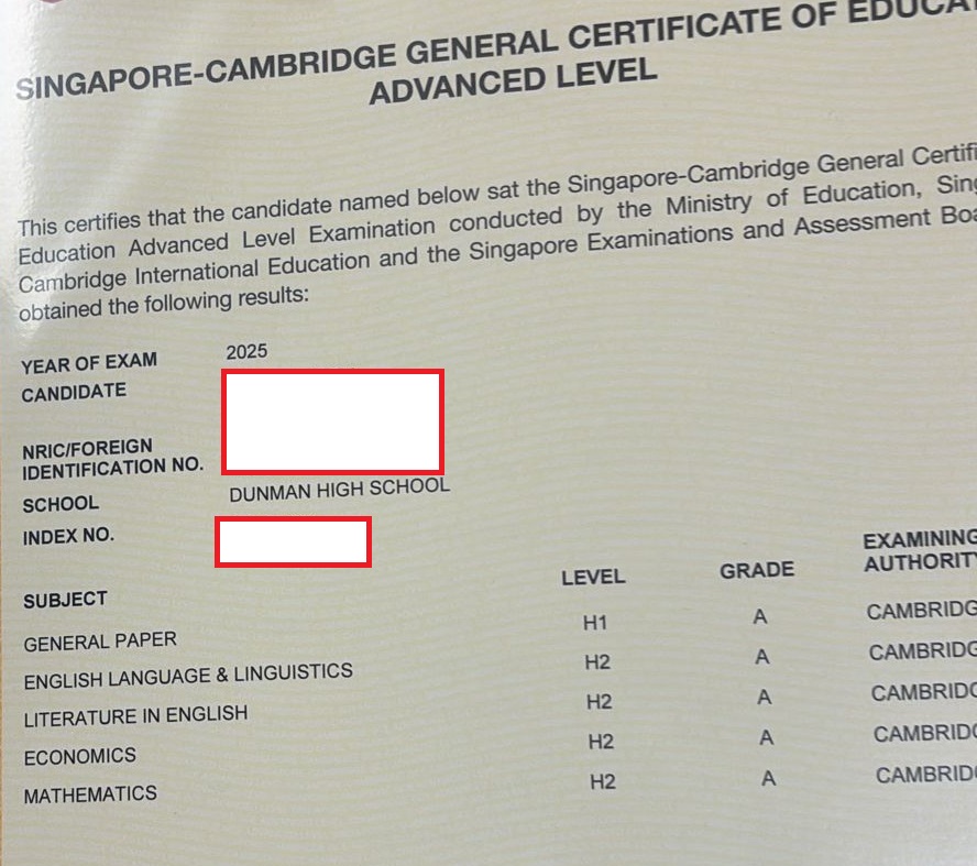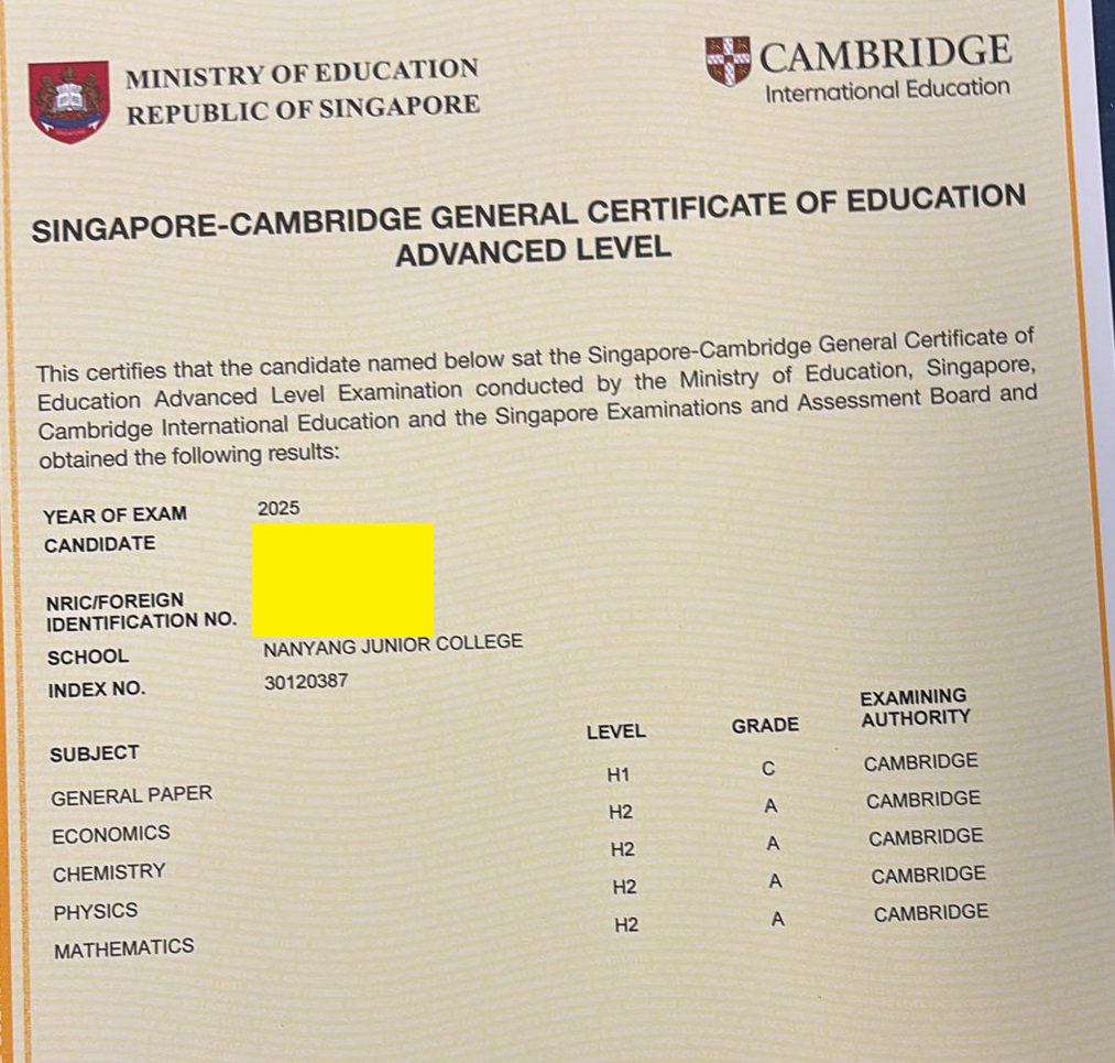 This NYJC student joined my group tuition at the start of J1 and sustained top performance throughout JC — scoring A grades and ranking within the 80th–100th percentile for all school exams, before achieving an A in the 2025 A-Levels.