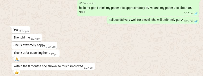 Mr Goh is the most dedicated teacher i have ever met! Whenever I asked questions outside of class, he would reply me right away and send me more practice questions relating to the same concept which is really useful in solidifying my foundation 🙂 When given a problem, he also has multiple solutions to solve them and will always teach us the fastest way which I usually don’t think of. This pushes me to think quicker because speed is really important in solving fundamental questions in papers that has a slightly different phrasing while testing on a similar concept so that there is more time left for the more unexpected questions which usually requires more room for thought. The practice questions given to me are also very diverse, which provides me with exposure to different styles of questions and prepares me for my exams more confidently. Thank you for your hard work Mr Goh 🙂 the A on my certificate would not have been there without your guidance